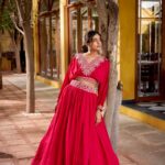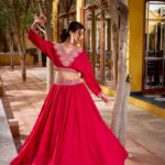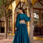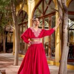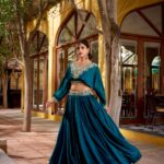 The deep V-neck blouse is designed with structured elegance, while the high-waisted lehenga skirt drapes beautifully for a flattering silhouette. Ideal for festive celebrations, weddings, and evening soirées, this set effortlessly elevates your ethnic wardrobe.