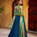 This breathtaking lehenga features a deep royal blue flared skirt embellished with delicate zari motifs and a richly woven Banarasi border. It is paired with a lustrous pista green silk blouse that offers a graceful structured fit.